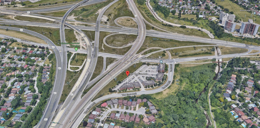 An application submitted to the City of Toronto seeks an Official Plan Amendment and rezoning to permit four new condominium towers on a suburban office campus site at 900 The East Mall on the southwest corner with Eglinton Avenue, and located just next to the meeting point of Highways 401 and 427 in Etobicoke. The proposal by Harhay Developments calls for four towers rising 20 and 21 storeys, with striking designs by Core Architects that take a spin on the traditional rectilinear condo tower massing.